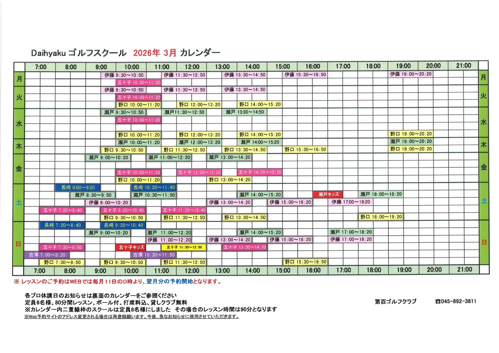 全ての曜日・時間帯でゴルフレッスンが受講可能。